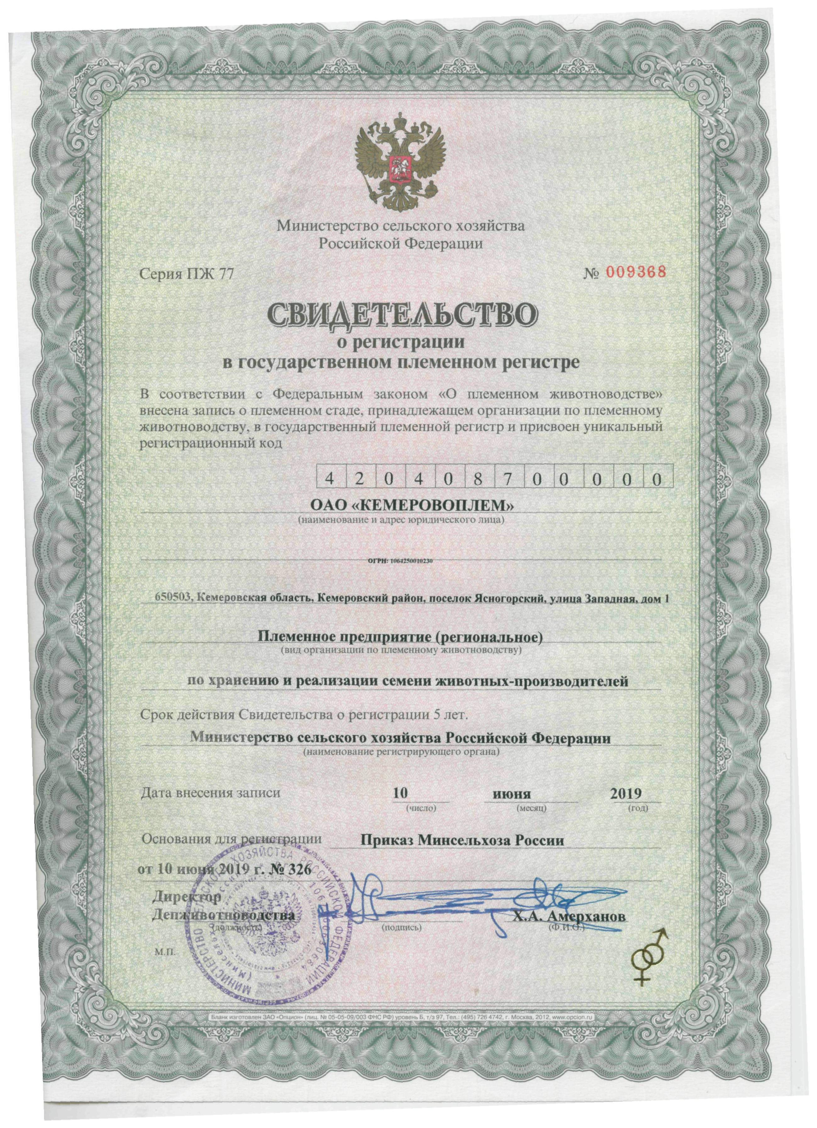 Свидетельство Племенное предприятие (региональное) по хранению и реализации семени животных-производителей